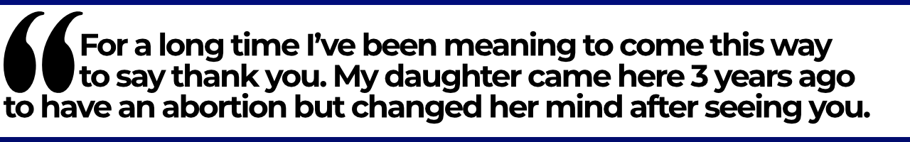 ‘For a long time I’ve been meaning to come this way to say thank you. My daughter came here 3 years ago to have an abortion but changed her mind after seeing you. She never told anyone on the day why she left but I want to say thank you because without you my grandchild wouldn’t be here’. An abortion minded couple said ‘We prayed for an angel to stop us having an abortion. The volunteer we met that day was our angel’. Another has become firm friends with the volunteer who encouraged them to choose life ‘If it wasn’t for you we would have had an abortion’ said one couple ‘You are our family now. We are calling our baby girl “Miracle” because that is what she is.’