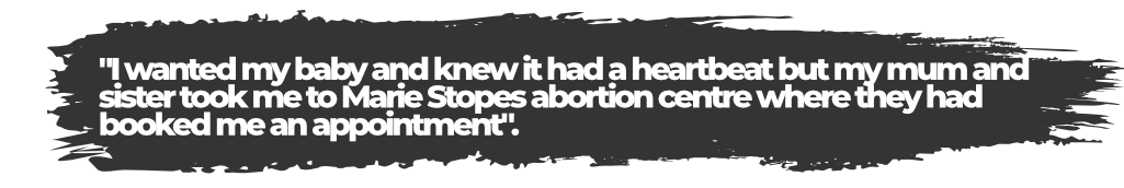 After a while, I met a new man and we began a relationship. Myself and my children were living with my mother (my father was no longer alive) so I kept this relationship secret as I knew my mother would disapprove. I became pregnant but sadly I had a miscarriage. It was particularly hard as I had to keep my grieving secret. In the end, my mum found out about the situation, she was horrified when I became pregnant again. I was told I had to choose between my baby and my family. Day and night I was continually going over things in my head, I didn’t know how to cope with the stress which was overwhelming. I wanted my baby and knew it had a heartbeat but my mum and sister took me to Marie Stopes abortion centre where they had booked me an appointment. I couldn’t stop crying but the nurse just told me she had booked me in tomorrow for an abortion.