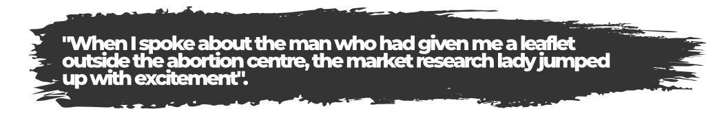 Things were still hard and I wished I could have some help as I was struggling. I was still very stressed and felt alone. One day when I was at home by myself there was a knock on my door. It was a lady doing market research. I invited her in and we had a chat. I don’t know why but when she remarked on my baby I found myself telling her the story of how my baby had nearly been aborted. When I spoke about the man who had given me a leaflet outside the abortion centre, the market research lady jumped up with excitement. ‘I’m part of the team that does that’ she told me, and she then phoned her friend who organised the team and I told her my story down the phone. We arranged to meet up and she has helped support me and my baby.