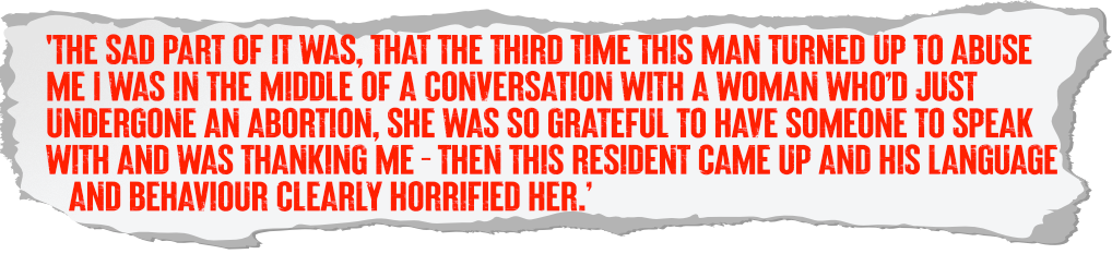 Truth be told, the boot is on the other foot. Local residents and those attending abortion appointments have become so fearful or angry after reading about alleged aggression directed at pregnant women that they have started lashing out in a pre-emptive strike. Peaceful pro-lifers up and down the country report how their signs offering help are snatched from them and thrown over hedges. Volunteers are regularly sworn at, threatened and spat upon.