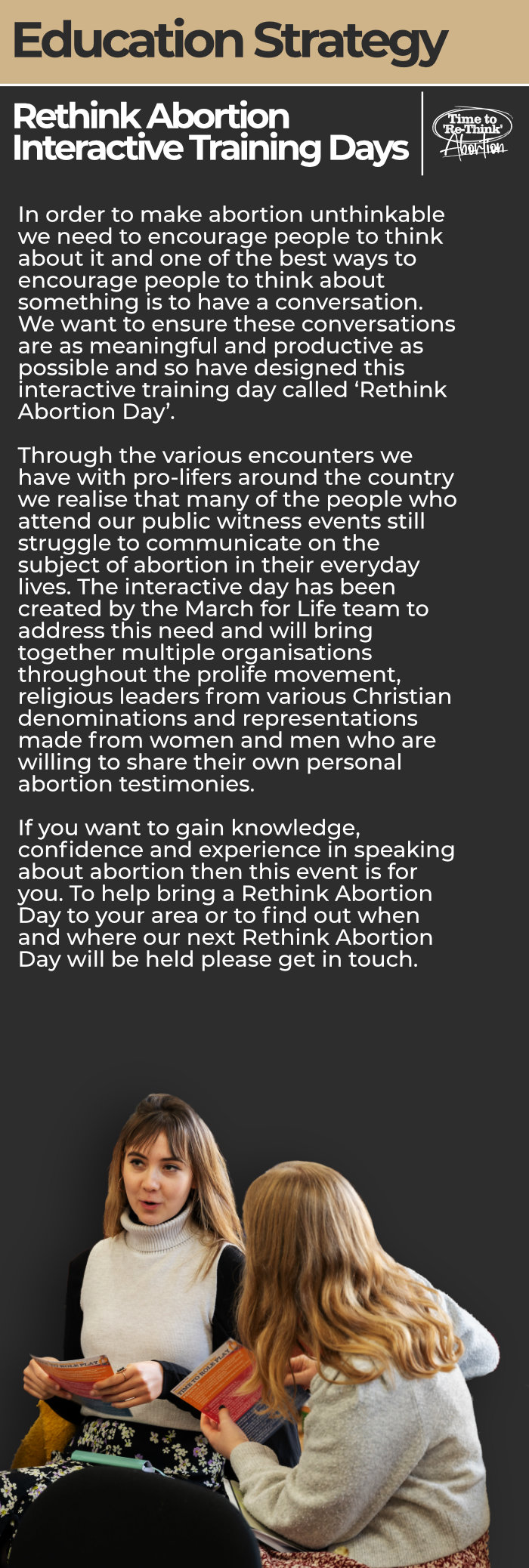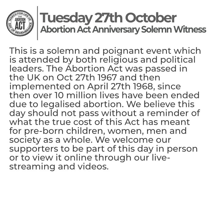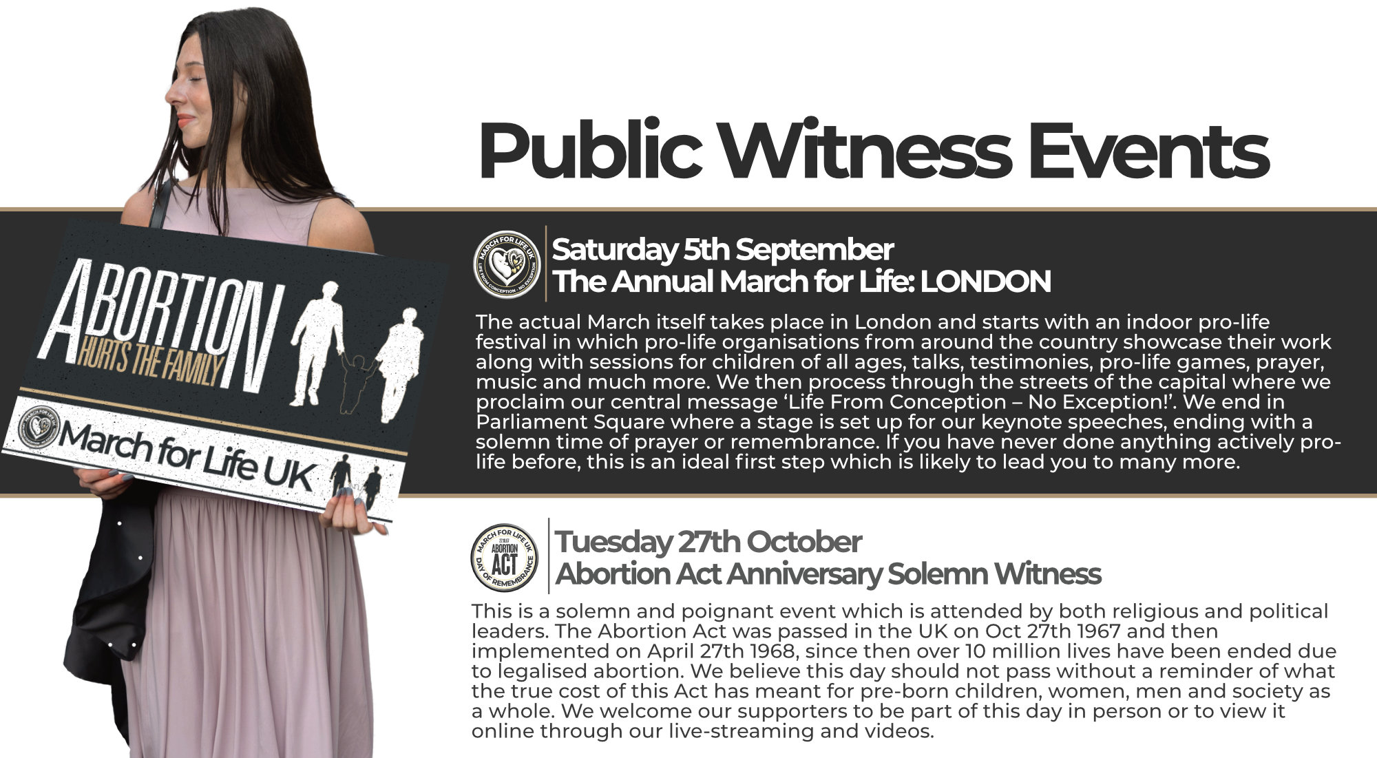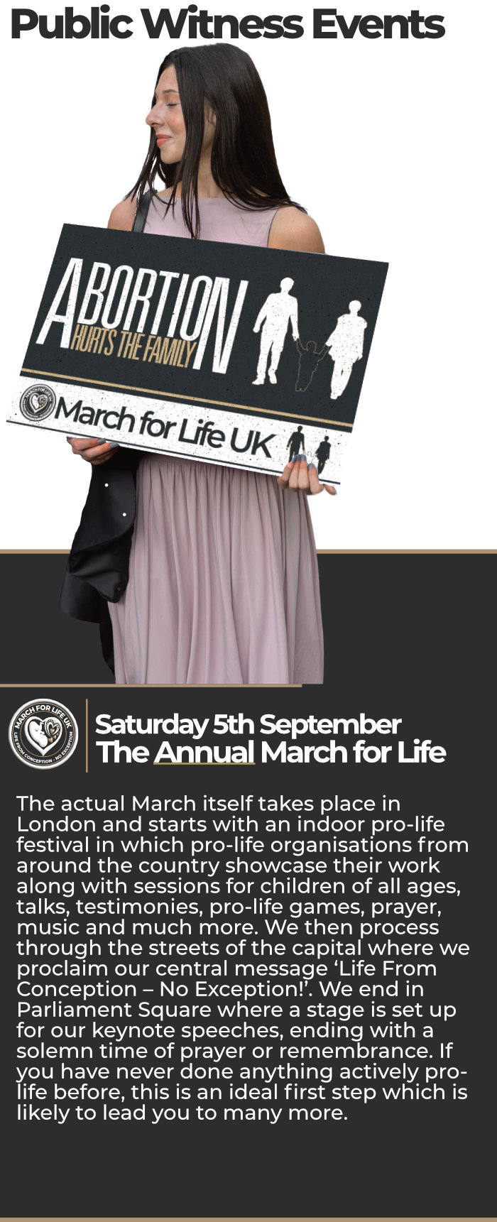 March for Life UK is a Christian pro-life organisation which incorporates three main annual events as well as a continuous mission comprising of three key aims.
